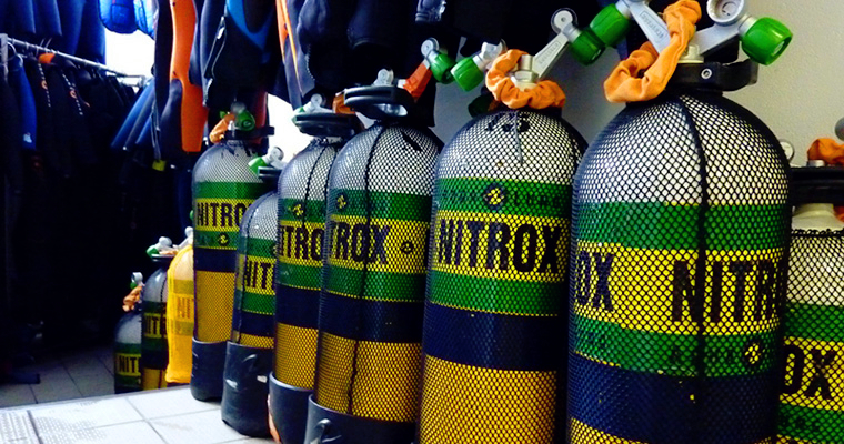 对于气瓶的使用也要特别注意,高氧潜水的气瓶上应该要有绿黄相间的标示记号,并有 Nitrox 的字样,每次使用前一定要以氧气测定仪检查氧气的浓度,并在电脑表上做调整。使用于高氧潜水的气瓶可以直接改作空气潜水使用,但是外部的标示一定要记得改正,以免发生误用,而使用过空气潜水的气瓶想改作高氧使用,则得经过仔细清洗的过程,去除瓶内杂质才可使用,否则也会有发生自然的危险。