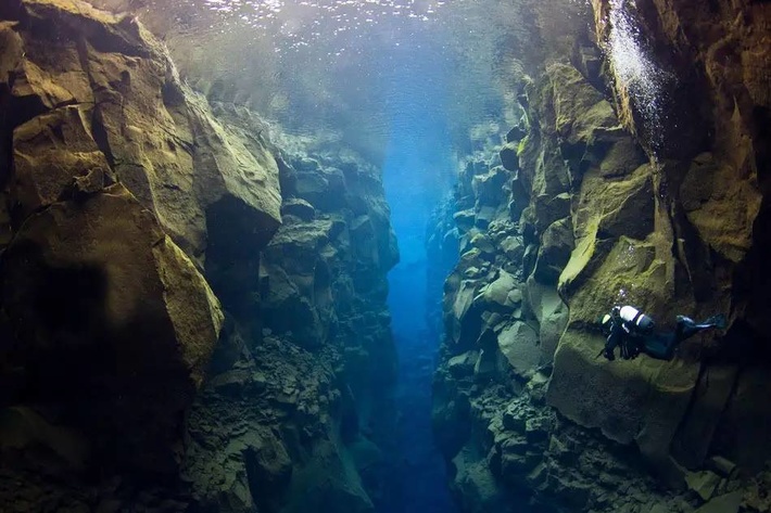 Silfra正是这样一个地处欧洲和美洲交界的大裂谷,潜入被海水掩盖的板块裂缝中,可以目睹大教堂般的裂隙形状,还有分隔地球地壳的缝隙。