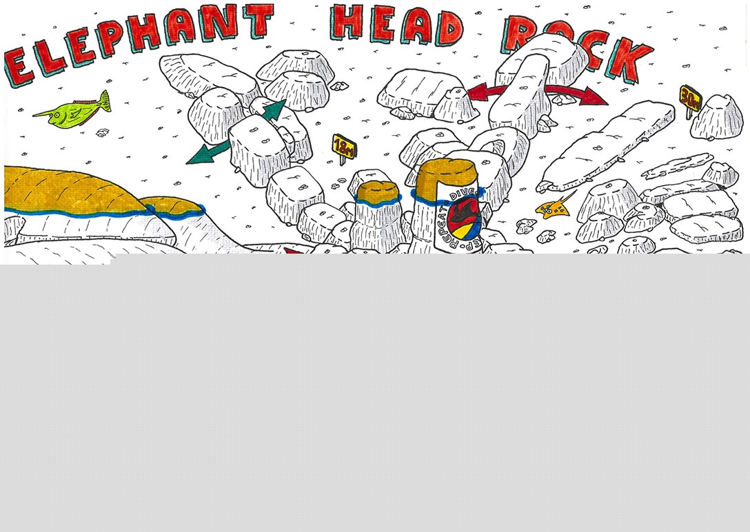 因潜点露出水面的石头像大象头而得名,离岛较远,流大,入水区域小,跳下船后需要尽快入水,否则容易被冲出潜点。潜点深度介于18到30米之间,水下有些石头通道可钻来钻去,非常有趣。大蓝水处经常出现大东西经过,在靠近30米左右深度有很大几率找到白鳍鲨或黑鳍鲨。需要注意的是在潜点西边大石头处有时候会有下降流,所以当游到这里的时候需要多注意自己的深度,在顶流的时候一定要跟紧教练,注意贴底或者贴石头。