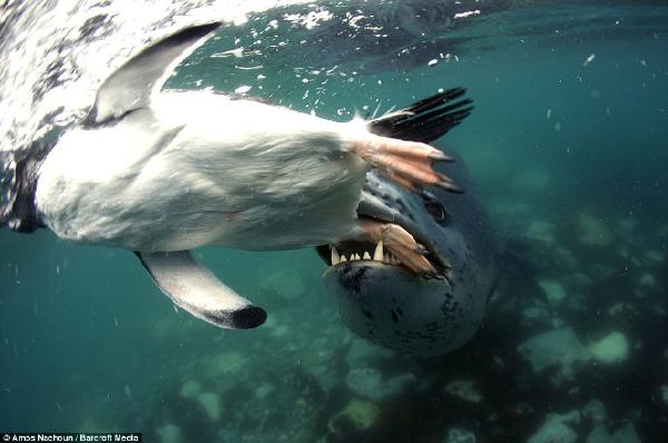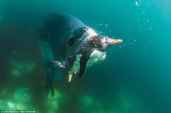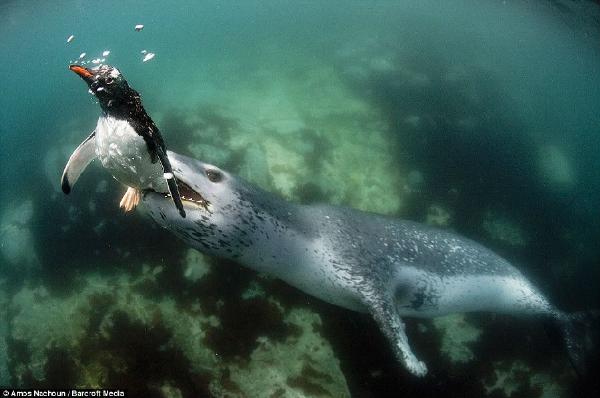 面对死亡 企鹅遇见了它的天敌leopard seal,在南极Port Lockroy 附近。 幼小的企鹅在浅水中玩耍,但是危险悄悄降临。