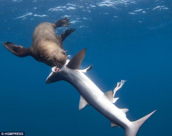 海豹攻击蓝鲨,这种镜头非常罕见。