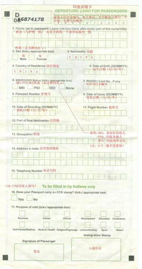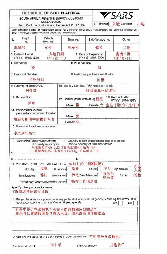 入境卡背面: