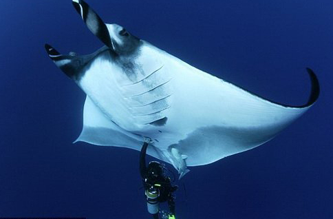 打招呼 通常蝠鲼都有一定的好奇心,为了吸引它,你对它做一些小的手势,甚至你呼吸时冒出水泡都会引起它的注意,让它为你放慢步伐。